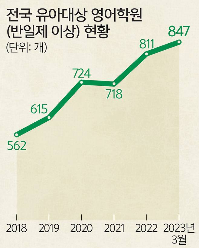 26일 교육부에 따르면 하루 4시간 이상 교습하는 유아 대상 영어학원은 지난해 3월 기준 전국 847개로 2018년(562개)보다 66.4%나 급증했다. 영어유치원은 법으론 존재하지 않는 단어여서 정부는 유아 대상 영어학원 중 1일 4시간 이상 수업하는 곳을 기준으로 규모를 파악하고 있다. 월평균 교습비는 전국 평균 174만4705원으로, 한 달에 300만원 가까이 내는 곳도 있다.