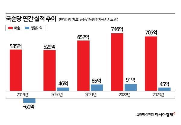 27일 금융감독원 전자공시시스템(DART)에 따르면 국순당의 지난해 연결 기준 매출액은 705억원으로 746억원이었던 1년 전과 비교해 5.5% 줄어든 것으로 집계됐다. 같은 기간 영업이익도 45억원으로 전년(91억원) 대비 51.2% 감소하면서 2020년 코로나19 팬데믹 이후 이어지던 상승세도 3년 만에 꺾이게 됐다.