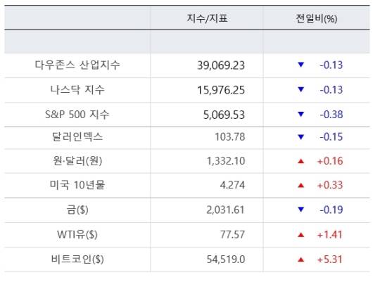 [미국증시 마감시황] 미국 뉴욕증시 3대 지수가 26일(현지시간) 일제히 하락 마감했다. 이번 주 발표되는 개인소비지출(PCE) 가격지수를 대기하며 경계감을 드러냈다. 이날 뉴욕증권거래소(NYSE)에서 다우존스30산업평균지수는 전장보다 0.13% 하락해 39,069.23에 마감했다. 대형주 중심의 S&P500지수는 0.38% 떨어져 5,069.53에, 기술주 중심의 나스닥 지수는 0.13% 내리며 15,976.25에 마감했다.