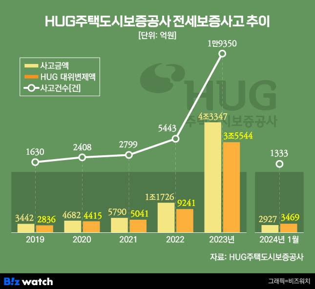 2019년 1630건 수준이던 전세보증사고는 지난해 1만9350건으로 12배 가까이 늘었고요. 같은 기간 사고금액은 3442억원에서 4조3347억원으로 약 13배 늘었습니다. HUG의 대위변제액은 2836억원에서 3조5544억원으로 큰폭으로 늘었습니다.2022년(9241억원)과 비교해도 1년 만에 2조6000억원 넘게 늘어난 규모입니다.