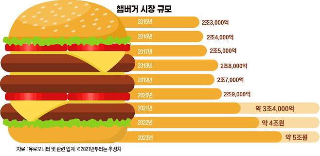 2020년 3조원 규모였던 햄버거 시장은 지난해 약 5조원대로 불어났다. 코로나19로 외식업계가 큰 어려움을 겪은 상황 속에서도 불과 2년 사이 70% 넘는 고성장을 했다.