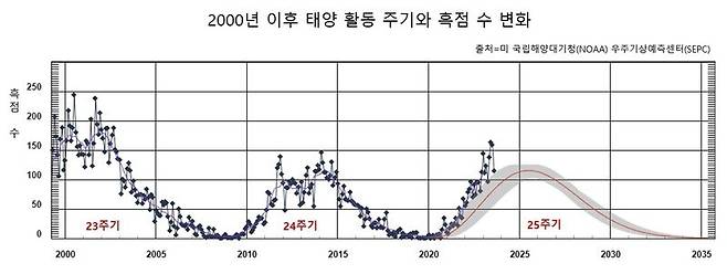 이에 따라 요즘 태양 표면의 폭발 현상이 잦아지고 흑점 수도 점점 늘어나고 있다. 태양 흑점은 활발해진 태양 활동으로 강력해진 자기장이 대류를 막아 주변보다 온도가 낮아져 어둡게 보이는 현상이다. 태양 극소기엔 흑점이 거의 사라졌다가 극대기에 가까워질수록 늘어나기 때문에 태양 활동을 나타내는 지표 역할을 한다. 태양 활동이 활발한 주기에는 극대기 흑점 수가 보통 200개 안팎까지 증가한다.