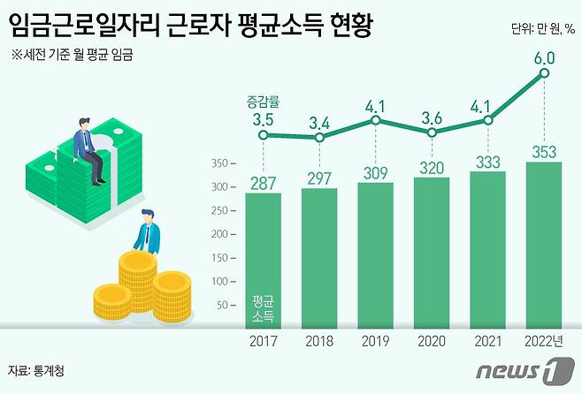 (서울=뉴스1) 김지영 디자이너 = 통계청이 27일 발표한 '2022년 임금근로일자리 소득(보수) 결과'에 따르면 재작년 임금근로자의 평균소득은 전년 대비 6.0%(20만원) 오른 353만원이었다. 전체 임금근로자 소득을 한 줄로 세웠을 때 중간값을 의미하는 중위소득은 267만원으로 전년 대비 6.9%(17만원) 증가했다.