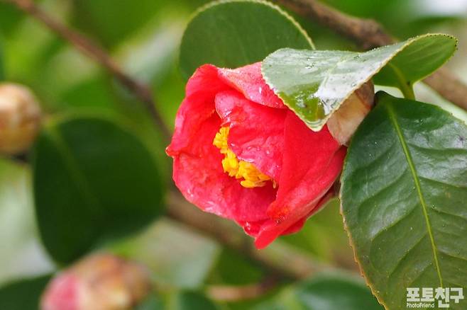 동백꽃은 비 맞아도 화사함을 잃지 않습니다.