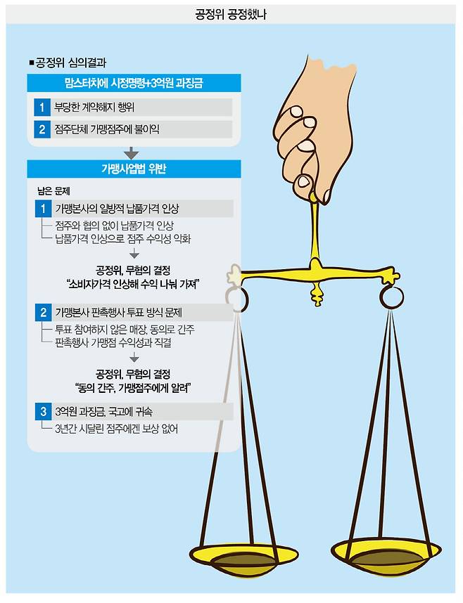 ■ 남은 문제➊ 판촉행사 = 공정위는 "점주의 완전한 동의를 얻지 않은 채 판촉행사를 진행했다"는 점주의 주장도 받아들이지 않았다. 맘스터치의 가맹계약서엔 "할인 등 판촉행사를 진행하려면 점주 50% 이상의 동의를 얻어야 한다"고 명시돼 있다.