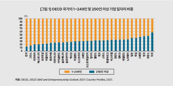 OECD에 따르면 한국은 경제협력개발기구(OECD) 기준 대기업(250인 이상)이 전체 일자리에서 차지하는 비중이 14%로 OECD 32개국 최하위다.