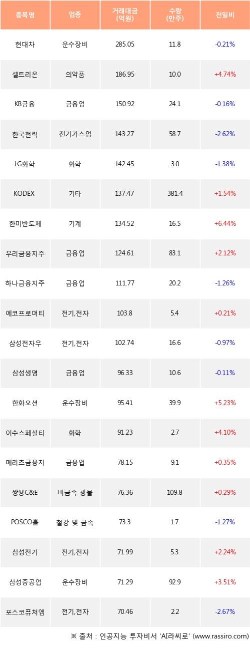 셀트리온, KODEX 코스닥150선물인버스, 한미반도체 등은 전일 대비 주가가 상승했고, 현대차, KB금융, 한국전력 등은 주가가 하락했다.