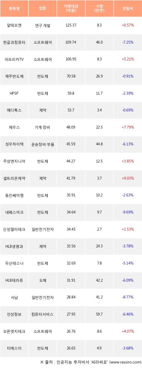 알테오젠, 아프리카TV, 제우스 등은 전일 대비 주가가 상승했고, 한글과컴퓨터, 제주반도체, HPSP 등은 주가가 하락했다.