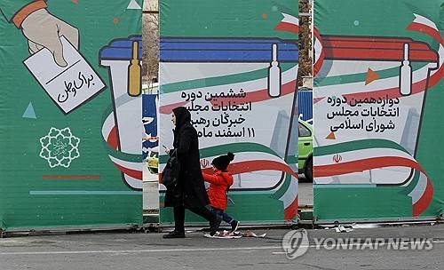 epa11184476 An Iranian woman with her child walk next to the general election billboard for the upcoming parliamentary elections, in a street in Tehran, Iran, 27 February 2024. Iranians on 01 March 2024 will vote for new members of Iran's parliament, and for the Assembly of Experts, the body in charge of appointing Iran's Supreme Leader. EPA/ABEDIN TAHERKENAREH