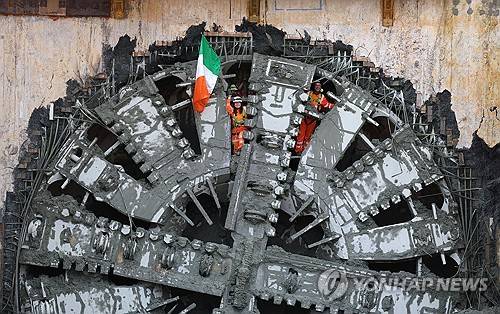 epa11184499 Workers hold an Irish flag at the cutting face of 'Florence' the boring machine after it broke through on the Chiltern Tunnel in Great Missenden, Britain, 27 February 2024. The Chiltern tunnel is 16km long, the longest rail tunnel in the UK. HS2 is a high speed rail line intended to run between London and the north of England. Florence is one of 10 machines digging over 32 miles of tunnel between London Euston and Birmingham. EPA/NEIL HALL