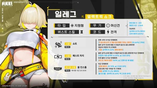 일레그 스킬을 살펴보면 1스킬 '쇼트'는 전투 시작 시 아군에게 적의 발사체에 가하는 대미지가 59% 증가한다. 또한 일반 공격 100회 명중 시 대상이 '붐 인스톨' 상태라면 대상과 주변 적 2기에게 최종 공격력의 91%만큼 분배 대미지를 준다.