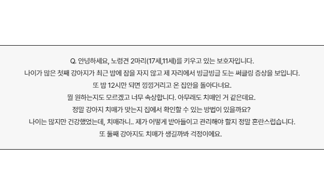 A. 안녕하세요, 방학동물병원 이상민 원장입니다. 이번 사연 속 보호자분은 노령견 2마리를 키우면서 노화와 관련된 여러 증상을 마주하신 것 같습니다. 강아지 치매가 의심되어서 마음이 많이 무거우실 것 같네요. 쉽게 단정할 수는 없으나, 사연 속 강아지의 치매(인지기능장애) 가능성이 높아 보이는 것은 사실입니다. 정확한 진단을 위해서는 동물병원에 방문하여 상담과 진찰을 받으시는 것을 추천해 드립니다. 그럼 보호자분이 걱정하시는 강아지 치매에 대해 자세히 알아보겠습니다.