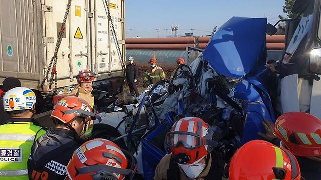 구조대원이 대형차 사이에 낀 SUV와 경차 운전자 2명을 구조해 병원으로 옮겼지만 끝내 숨졌습니다.