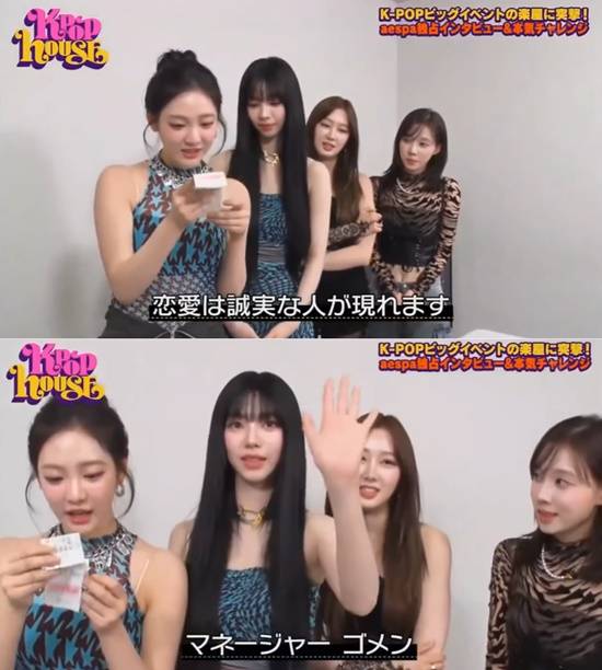 닝닝은 "돈 굿, 일도 굿"이라며 엄지를 치켜 들었다. 이어 "연애? 성실한 사람?"이라 읽었고, 카리나는 "매니저 고멘(미안)"이라며 농담 섞인 사과로 웃음을 자아냈다.