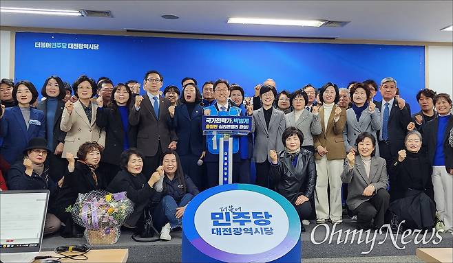 | ▲ 더불어민주당 박범계(대전서구을) 의원이 28일 민주당 대전시당에서 4선 도전 출마를 선언했다. 사진은 박 의원의 출마를 응원하기 위해 찾아온 지지자들과 '총선승리' 구호를 외치는 모습. |