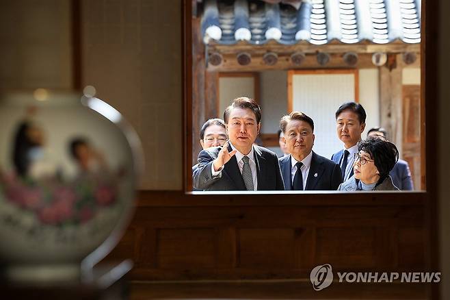 (서울=연합뉴스) 홍해인 기자 = 윤석열 대통령이 28일 오전 충북 옥천군 고(故) 육영수 여사 생가를 방문해 내부를 둘러보고 있다. 2024.2.28 [대통령실 제공. 재판매 및 DB 금지]