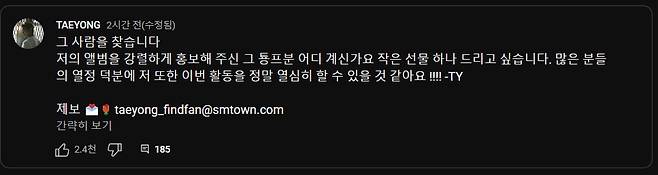 (엑스포츠뉴스 김예은 기자) 최근 솔로로 컴백한 NCT 태용이 한 팬을 찾아 헤매고 있다.