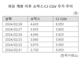28일 한국거래소에 따르면 이날 영화배급사 쇼박스 주가는 전 거래일 대비 12.33% 오른 4420원에 장을 마감했다. 장중에는 15.50% 오르며 4545원을 터치했다. CJ CGV는 4.31% 오른 6050원에 거래를 마쳤다.