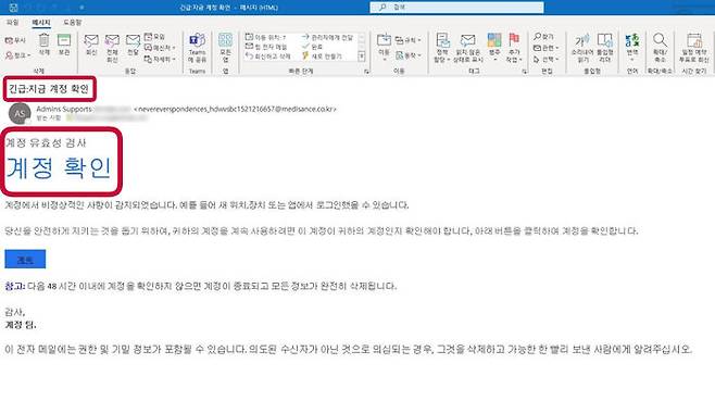 또 "48시간 이내에 계정을 확인하지 않으면 계정이 종료되고 모든 정보가 완전히 삭제된다"며 사용자를 불안하게 해 악성 인터넷주소(URL)를 클릭하도록 재촉했습니다.