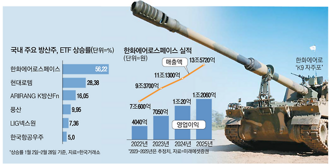 한화에어로스페이스 주가는 올해 들어서만 56.22% 급등하며 신고가를 경신했다. 그 밖에 현대로템(28.38%), 풍산(9.95%), LIG넥스원(7.36%), 한국항공우주(5%) 등 기타 K방산 테마 종목들도 시장 평균인 코스피 수익률(-0.11%)을 웃돌았다.