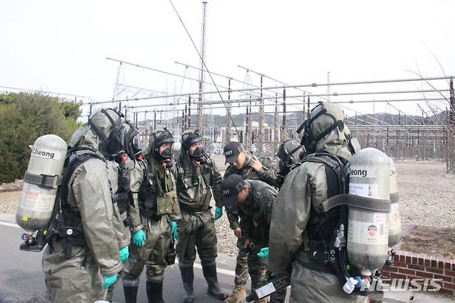 [포항=뉴시스] 안병철 기자 = 28일 경북 포항시 남구 한국전력공사 포항지사에서 실시된 합동 대테러 훈련에서 해병대 화생방 신속대응팀(CRRT)이 작전 지시를 받고 있다. 2024.02.28. abc1571@newsis.com