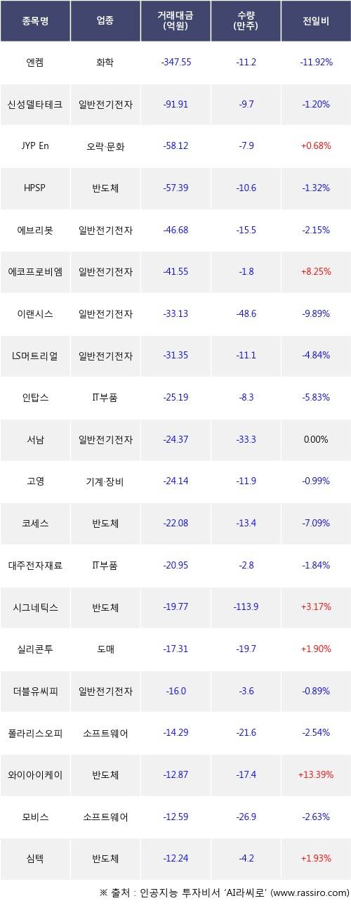 외국인 투자자의 순매도 상위 20개 종목은 엔켐, 신성델타테크, JYP Ent., HPSP, 에브리봇, 에코프로비엠, 이랜시스, LS머트리얼즈, 인탑스, 서남등이다.