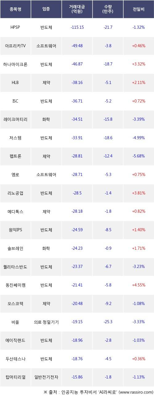 기관 투자자의 순매도 상위 20개 종목은 HPSP, 아프리카TV, 하나마이크론, HLB, ISC, 레이크머티리얼즈, 저스템, 펩트론, 엠로, 리노공업등이다.