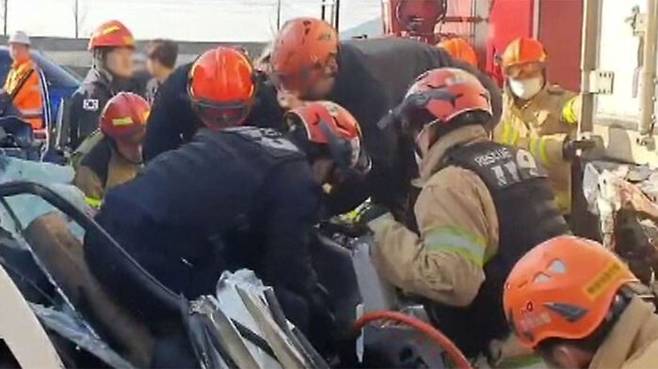 트레일러와 화물차 사이에 찌그러진 차량 안에서 구조대원들이 운전자를 구조하고 있습니다.