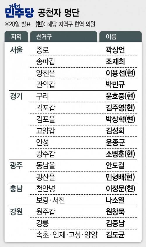 한편, 3인 경선을 치른 경기 고양병은 김재준 전 김진표 의장 공보수석비서관이 탈락하고 홍정민 의원과 이기헌 전 청와대 민정비서관이 결선을 치른다.