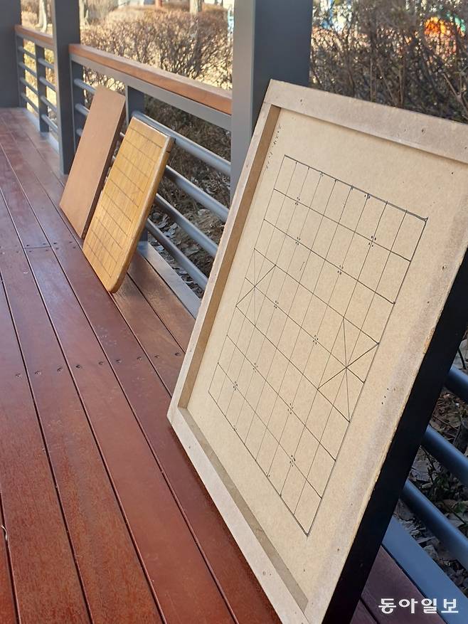 공원 벤치에 장기판들이 쉬고 있네요. 봄이면 찾아오는 사람들로 쉴 새 없을 테니 지금은 좀 쉬어 두어요.