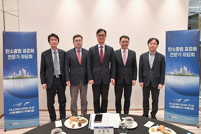 | 탄소중립 표준화 논의를 위해 모인 산·학·연 전문가 진종욱 국가기술표준원 원장(가운데), 인하대학교 강홍윤 교수(맨 왼쪽), 한국생산기술연구원 이상목 원장(왼쪽 두번째), 두산에너빌리티 정연인 부회장(오른쪽 두번째), 삼성전자 서영진 상무(맨 오른쪽)가 28일 오후 잠실 소피텔 엠베서더에서 열린 탄소중립 표준화 전문가 좌담회에서 사진을 찍고 있다. |