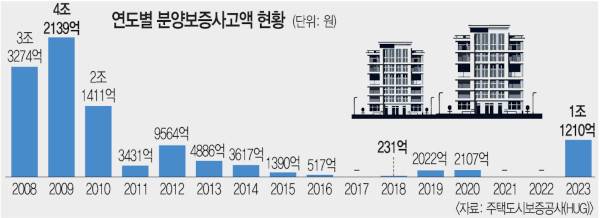 2021년과 2022년 한 건도 없던 분양·임대 보증사고는 지난해 10건을 기록했다. 사고액은 1조1210억원으로 미국발 금융위기 여파가 이어진 2010년(2조1411억원) 이후 최대였다. 올해는 두 달 만에 5건을 기록한 데다 사고액도 2100억원을 넘어섰을 정도로 증가 속도가 빨라 연간 보증사고 규모가 지난해 수준을 넘어설 수 있다는 우려가 나온다.