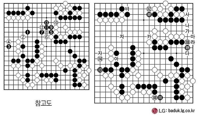큰 곳을 찾기가 어려운 국면. AI는 107로 참고도처럼 둘 것을 추천했다. 포인트는 5의 끊음이다. 13까지 백을 상하로 갈라쳤으면 흑에게 즐거움이 많았으리란 게 인공지능의 설명이다. 112는 역끝내기로 큰 자리지만 지금은 실착. ‘가’~’마’의 수순으로 우변에서 패를 걸어갈 절호의 기회였다. 백은 ‘바’, ‘사’, ‘아’ 등 팻감도 풍부하다.