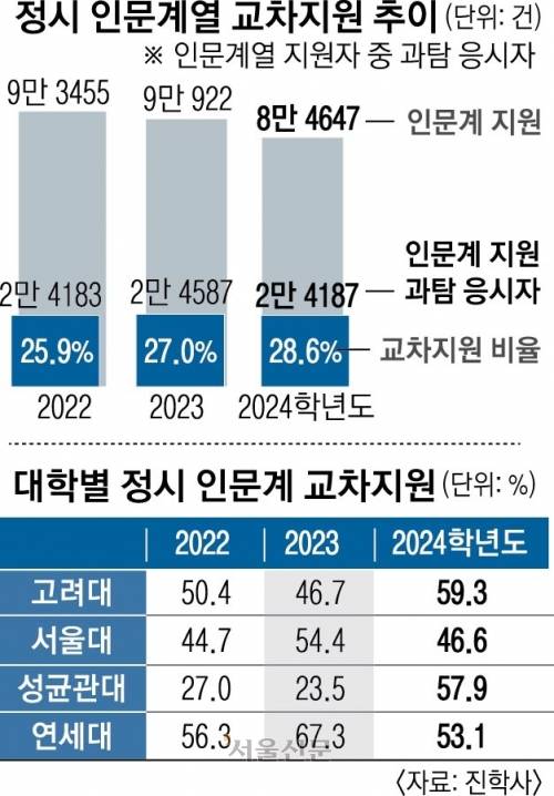 다만 대학별로 교차 지원 양상은 엇갈렸다. 서울대와 연세대는 지난해 교차 지원이 늘었지만, 올해는 감소했다. 서울대는 인문계열 지원자의 46.6%가 이과생으로 지난해(54.4%)보다 7.8% 포인트 줄었고 연세대도 지난해(67.3%)보다 14.2% 포인트 줄어든 53.1%로 집계됐다.