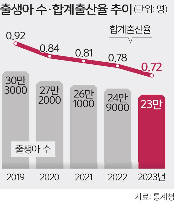 2022년 처음으로 합계출산율(여성 1명이 평생 낳을 것으로 예상되는 평균 출생아 수) 0.8명대가 무너진 뒤 사실상 0.6명대로 추락했다.