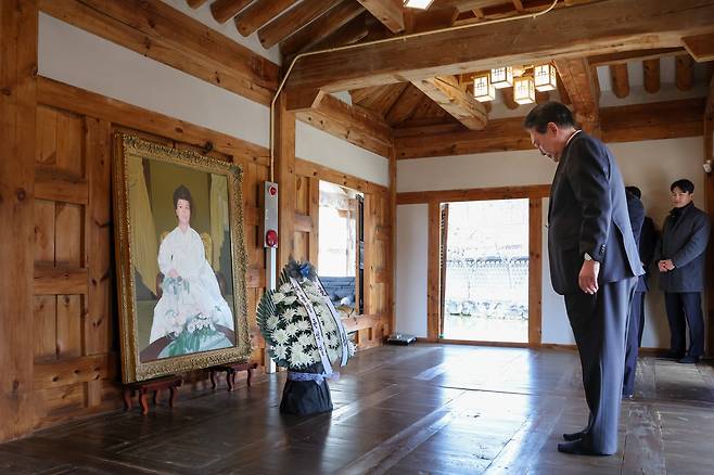 | ▲ 고 육영수 여사 생가 방문한 윤석열 대통령 윤석열 대통령이 28일 오전 충북 옥천군 고 육영수 여사 생가를 방문해 헌화 뒤 묵념하고 있다.[대통령실 제공] |