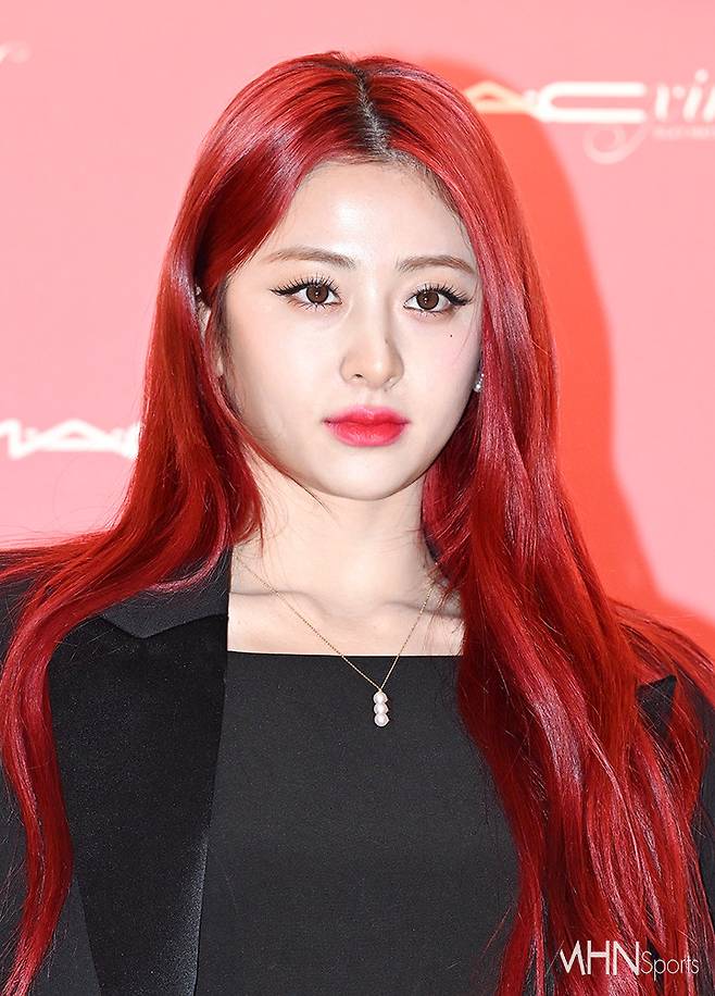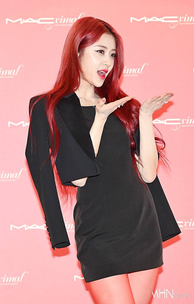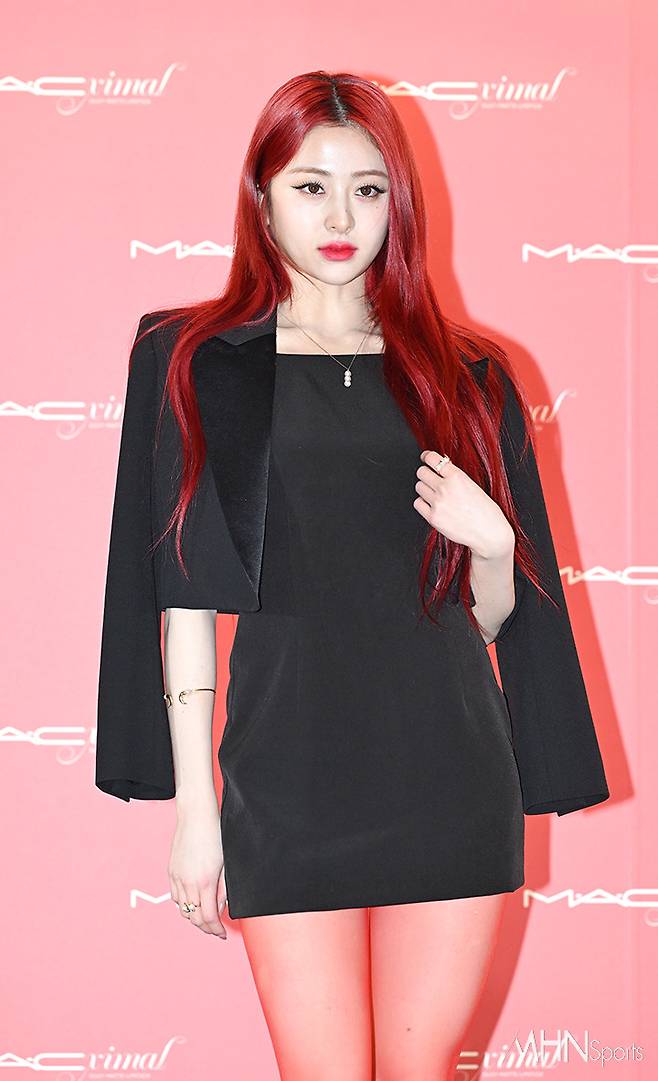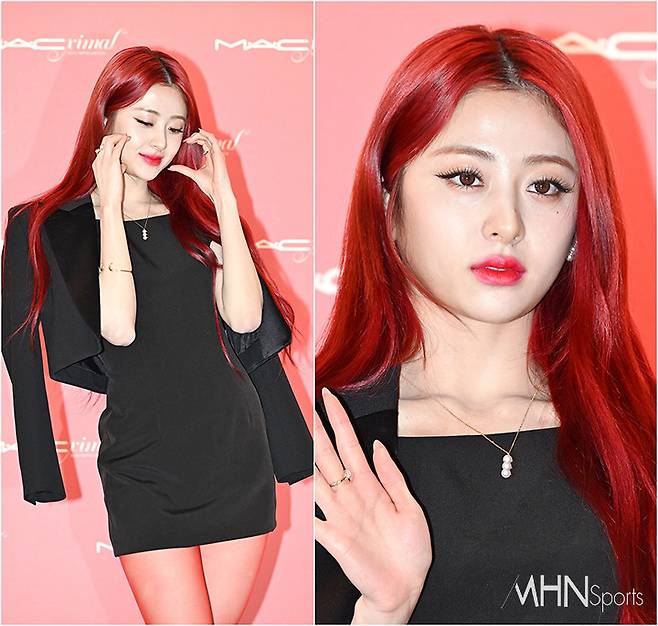 허윤진은 블랙 스트랩 힐과 몸매 라인이 돋보이는 블랙 미니 원피스에 재킷을 매치해 섹시한 올블랙 패션을 선보였다. 특히 레드톤의 스타킹으로 시선을 사로잡는 매혹적인 룩을 완성시켰다.