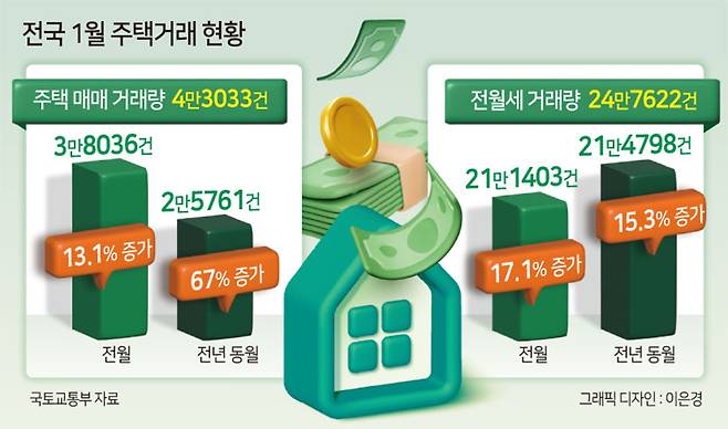 지역별로 보면 수도권(1만7608건)은 전월보다 16.7% 늘었고, 지방(2만5425건)은 10.8% 증가했다. 작년 1월과 비교하면 수도권은 71.0%, 지방은 64.4% 증가했다. 서울은 4699건으로 전월(4073건)보다 15.4%, 1년 전(2641건)보다 77.9%씩 늘었다. 유형별로 보면 아파트(3만2111건)는 전월 대비 19.2% 증가했지만, 아파트 외 주택(1만922건)은 전월보다 1.6% 감소한 것으로 나타났다.