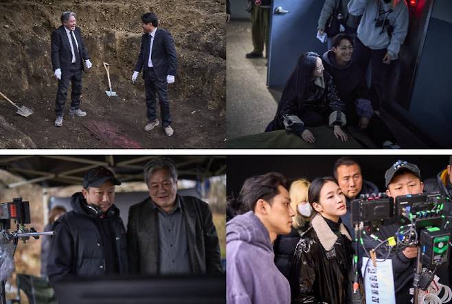 이와 함께 ‘파묘’ 측은 카메라 밖에서도 계속되는 배우들의 호흡과 뜨거운 열정을 느낄 수 있는 현장 비하인드 스틸을 공개했다. 공개된 스틸은 현장의 유쾌한 분위기와 전문가 캐릭터를 완벽 소화하기 위한 배우들의 노력을 담아 시선을 끈다. 먼저 최민식과 유해진이 서로를 보며 유쾌하게 웃고 있는 스틸과, 김고은과 이도현이 휴식을 취하며 미소 짓고 있는 스틸은 카메라 밖에서도 흘러 넘치는 파트너 케미를 엿볼 수 있게 한다. 장재현 감독과 함께 촬영본을 모니터링 하고 있는 풍수사 ‘상덕’ 역의 최민식, 무속인 ‘화림’ 역의 김고은, 장의사 ‘영근’ 역의 유해진, 무속인 ‘봉길’을 연기한 이도현의 모습은 캐릭터를 완벽하게 소화하기 위한 뜨거운 열정과 프로 정신을 담아 관람 욕구를 자극한다.