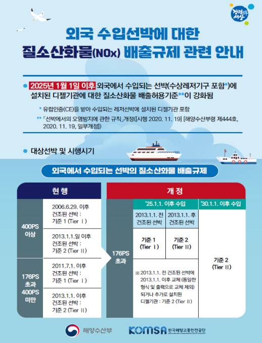 29일 해양수산부에 따르면 현행 해양환경관리법에는 2025년 1월 1일부터 수입되는 모든 외국 선박은 질소산화물 배출량 기준에 따라 적절한 디젤기관을 설치하도록 규정되어 있다. 만약 조건을 충족하지 못하면 운항이 허가되지 않는다. 이 조치는 선박에서 발생하는 여러 가지 대기오염물질 가운데 국제암연구소가 1급 발암물질로 지정한 질소산화물로 인한 피해를 줄이기 위해 마련됐다. 질소산화물은 호흡기 및 심혈관계 질환, 면역체계 이상 등을 불러오는 것으로 알려져 있다. 또 오존층을 파괴하고 산성비를 내리게 하는 주요 요인으로도 거론되면서 전 세계적으로 규제가 갈수록 강화되는 추세를 보인다.