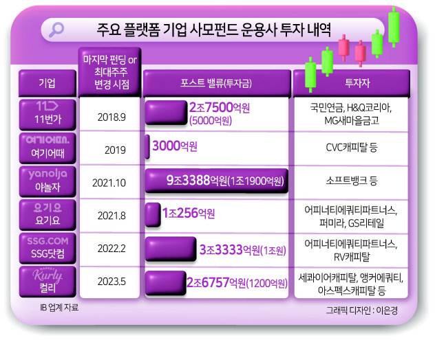 플랫폼 기업에 투자한 국내외 사모펀드(PEF) 운용사가 청구서를 들고 있지만 최종 회수까지 난관이 예상된다. 주요 플랫폼 기업이 호황기 멀티플을 입증할 실적을 보여주지 못하고 있다.