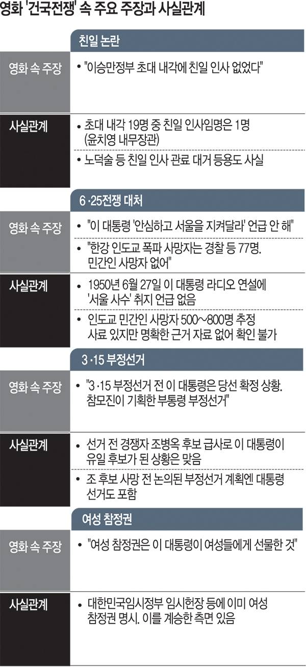 국민일보는 영화가 다룬 이 전 대통령 행적 중 ‘친일 논란’ ‘서울 피란’ ‘3·15 부정선거’ 등을 중심으로 사실관계를 확인했다. 영화 속 주장의 근거는 대체로 역사적 자료와 일치했지만, 이 전 대통령 발언·기록을 일부만 인용하거나 전후 맥락을 생략한 채 단편적으로 서술한 부분도 적지 않았다.
