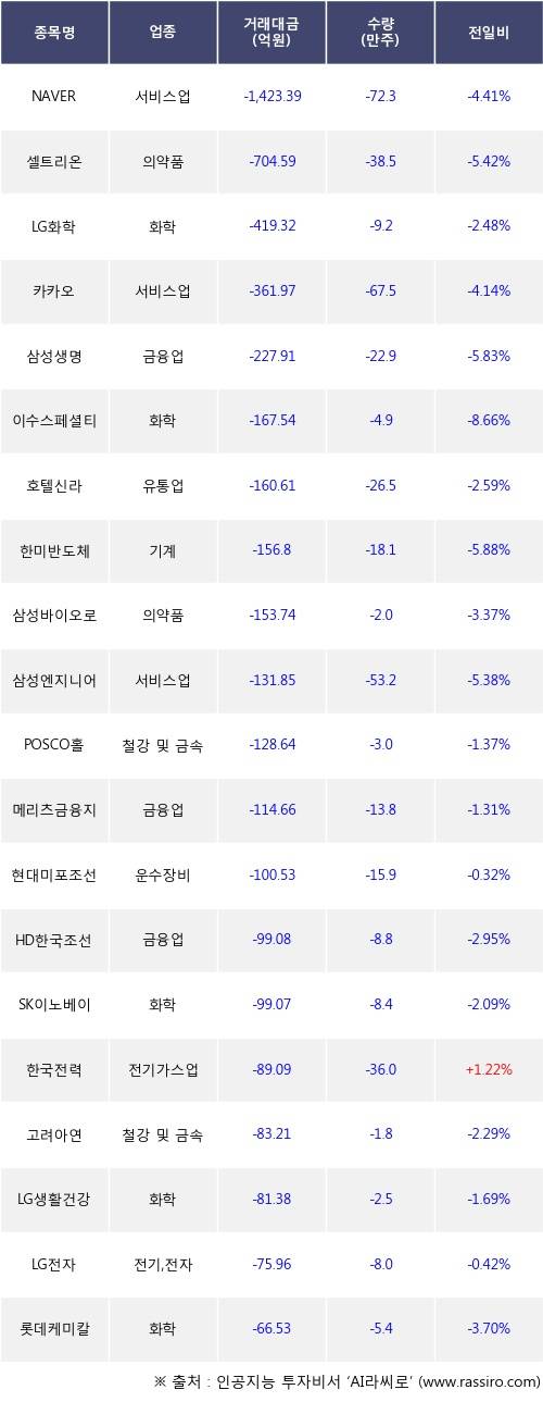 외국인 투자자의 순매도 상위 20개 종목은 NAVER, 셀트리온, LG화학, 카카오, 삼성생명, 이수스페셜티케미컬, 호텔신라, 한미반도체, 삼성바이오로직스, 삼성엔지니어링등이다.