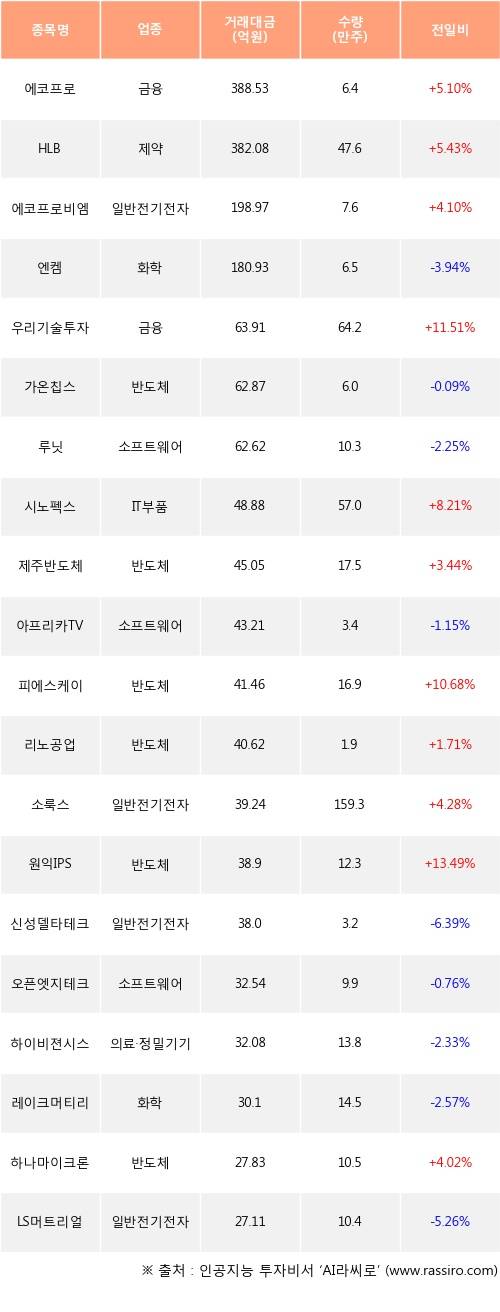 에코프로, HLB, 에코프로비엠 등은 전일 대비 주가가 상승했고, 엔켐, 가온칩스, 루닛 등은 주가가 하락했다.