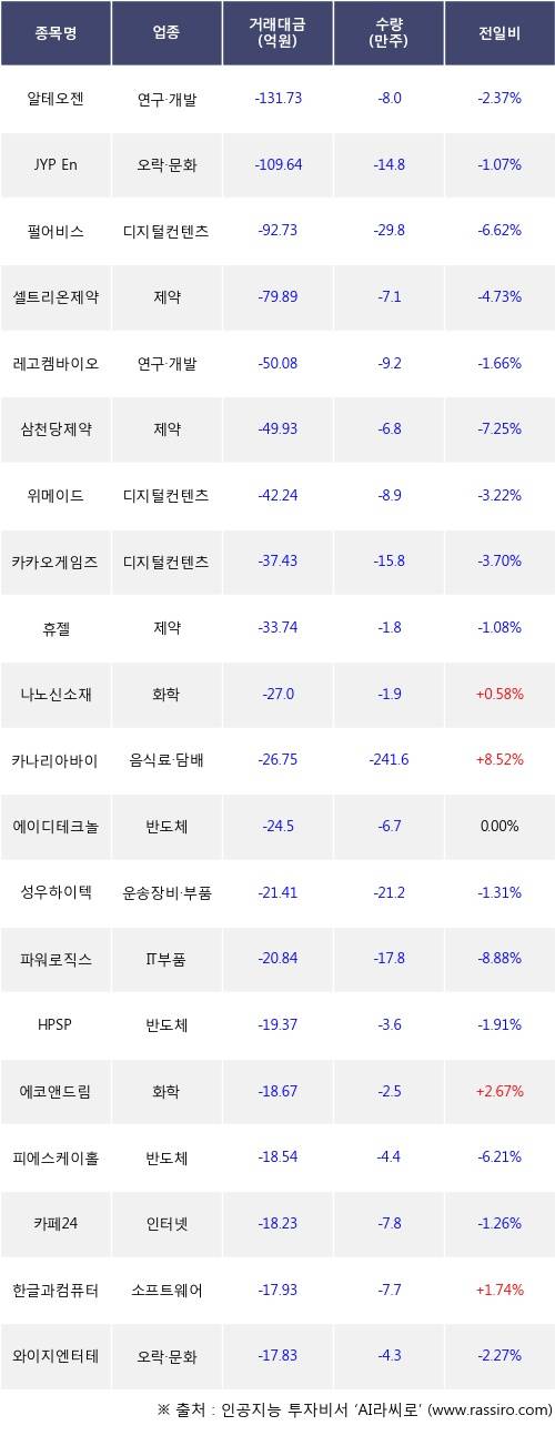 외국인 투자자의 순매도 상위 20개 종목은 알테오젠, JYP Ent., 펄어비스, 셀트리온제약, 레고켐바이오, 삼천당제약, 위메이드, 카카오게임즈, 휴젤, 나노신소재등이다.