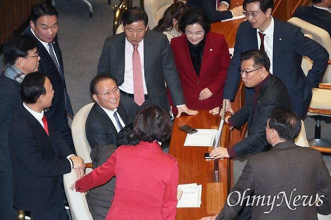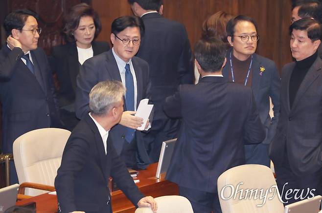 한편, 국민의힘은 상대적으로 밝은 표정으로 본회의장을 빠져나왔다.