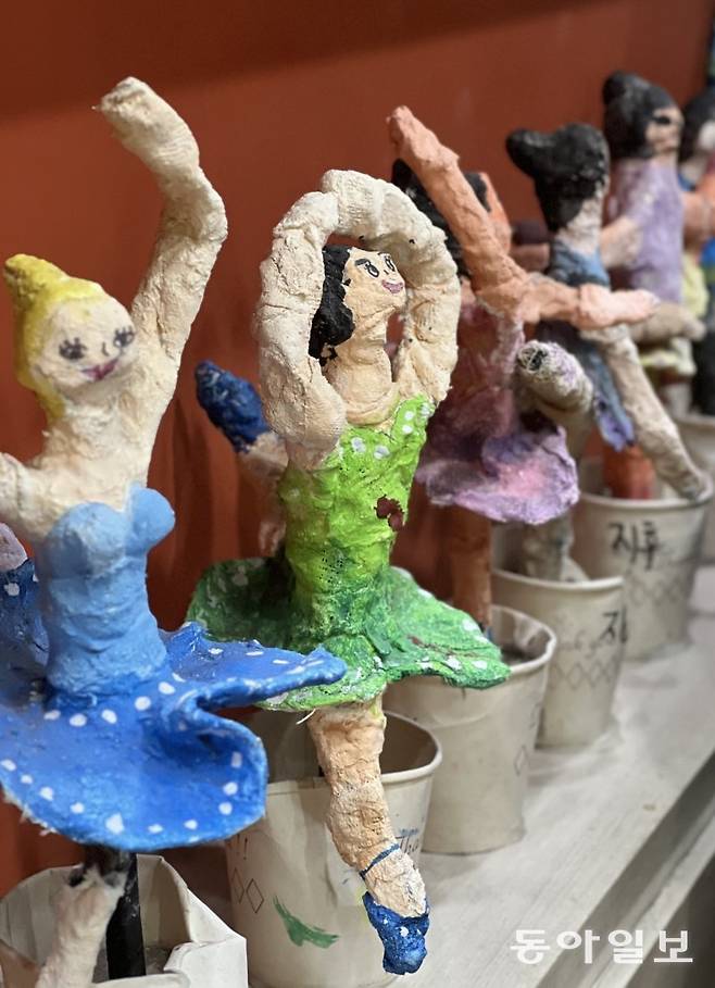 종이컵 안 지점토 발레리나들 사이로 슬며시 한 다리를 밖으로 내민 발레리나가 보입니다. 뛰어나가고 싶은 걸까요?
