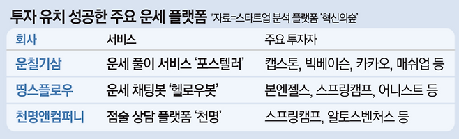 운세를 보는 것이 비과학적이라는 일부의 인식과 달리 여러 벤처캐피털(VC)로부터 투자 유치에 성공한 운세·사주팔자 플랫폼 스타트업이 잇따라 나와 눈길을 끈다.