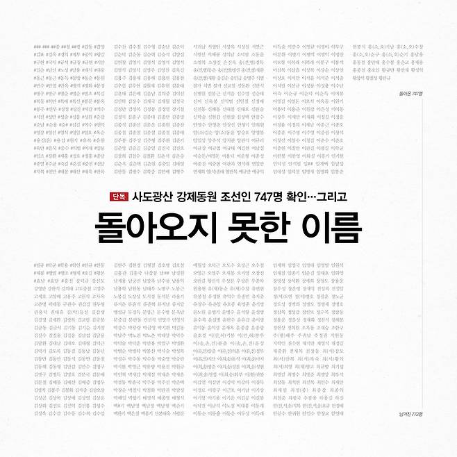그리고 최소 772명이 남았다. 이름도 나이도 고향도, 왜 죽었고 어디에 묻혔는지조차 모른다. 가족이 한국에 생존해 있더라도 이들이 사도광산 강제동원 피해자임을 여태껏 모르고 있을 가능성이 높다. 광복 후 한국 정부가 시행한 강제동원 피해 조사에서조차 이들의 존재가 드러나지 않았다. 즉, 일본으로 강제동원 돼 현지에서 사망했을 가능성이 높다는 의미다. 밝혀낸 747명의 이름은 현재까지 공개된 모든 자료를 참고한 결과다. 이제 나머지 빈 공간을 채워야 할 것은 비공개 자료를 소장한 일본 정부와 이들을 관리했을 전범기업 미쓰비시다. 반일, 친일, 과거사, 미래 등 정치적 수사로 뒤범벅된 문제를 말하는 것이 아니다. 잊지 말아야 한다. 일제가 강제로 끌고 가 존재 자체가 사라져 버린 것은 기계나 동물이 아닌 ‘사람’이다.