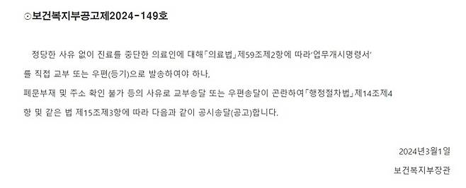 정부는 공시송달문에서 "의료인의 집단 진료 중단 행위는 국민의 건강과 생명에 막대한 지장을 초래할 우려가 있으므로, 동 업무개시명령서를 확인하는 즉시 소속 수련병원에 복귀하여 환자 진료 업무를 개시하여 주시기 바란다"며 "정당한 사유 없이 업무개시 명령을 거부하는 경우 '의료법'제66조 및 제88조에 따라 처분 및 형사고발 될 수 있음을 알려드린다"고 밝혔다.